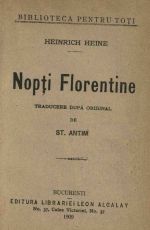 Format: 15/10 cm- În timpul șederii sale în Italia, Heinrich Heine (1797-1856) a vizitat Florența, de care a fost încântat peste măsură. Rezultatul literar al acestei vizite a fost binecunoscuta fantastică și strălucitoarea Nopți florentine. Este o serie de tablouri strălucitoare unite printr-un fir foarte fin de legătură; este fermecătoare prin rătăcirea sa vagă și lipsită de evenimente, cu sugestia puternică a marelui original, O mie și una de nopți, și cu contrastul său și mai puternic. În plus, în această poveste de dragoste apar unele dintre cele mai bune exemple ale firii mușcătoare a lui Heine.